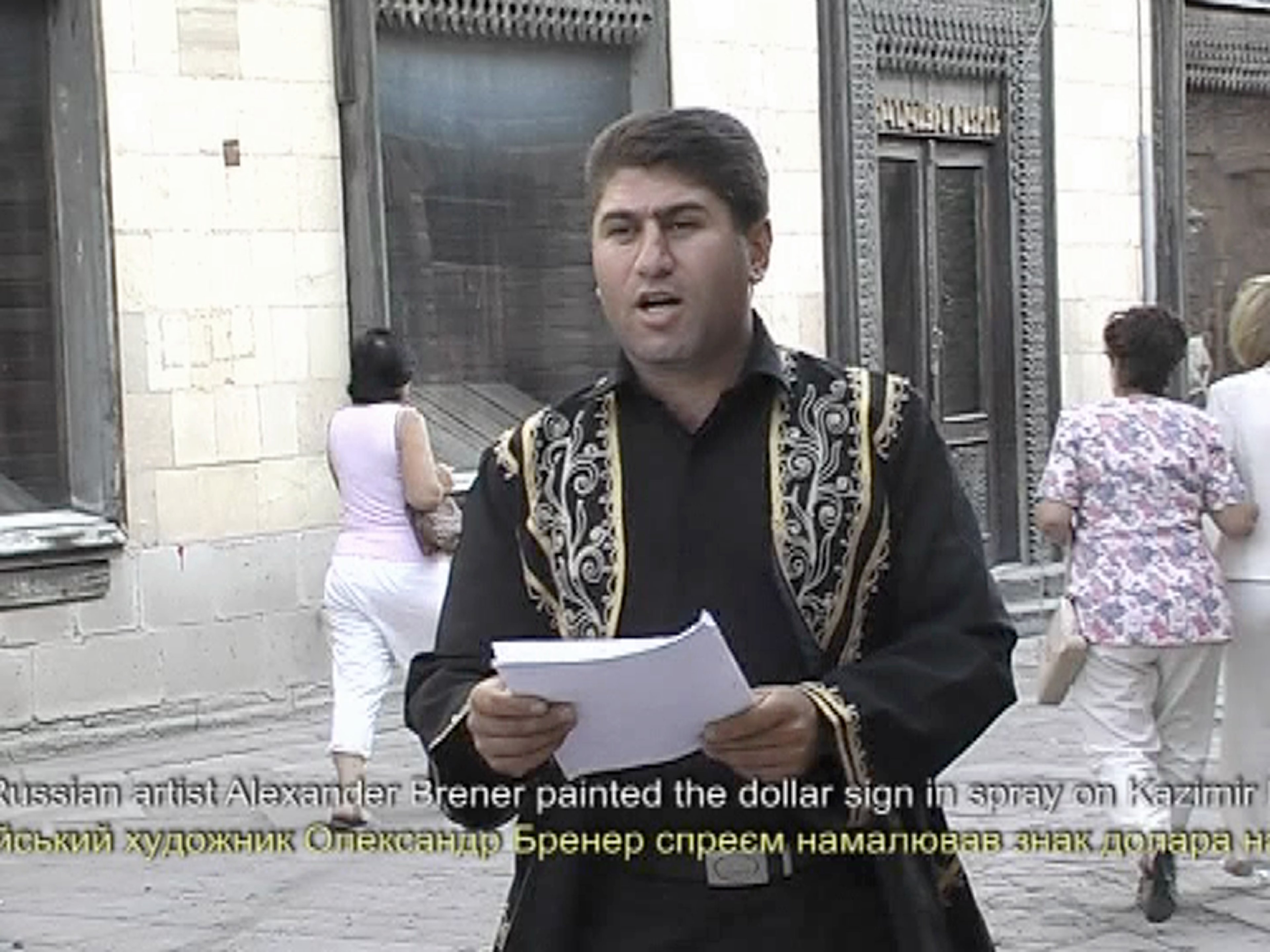 The video installation Mediators includes documentation of six street performances carried out by R.E.P in Kyiv (Ukraine), Gyumri (Armenia), Almaty (Kazakhstan), Plovdiv (Bulgaria), Schwaz (Austria) and Byalystok (Poland).