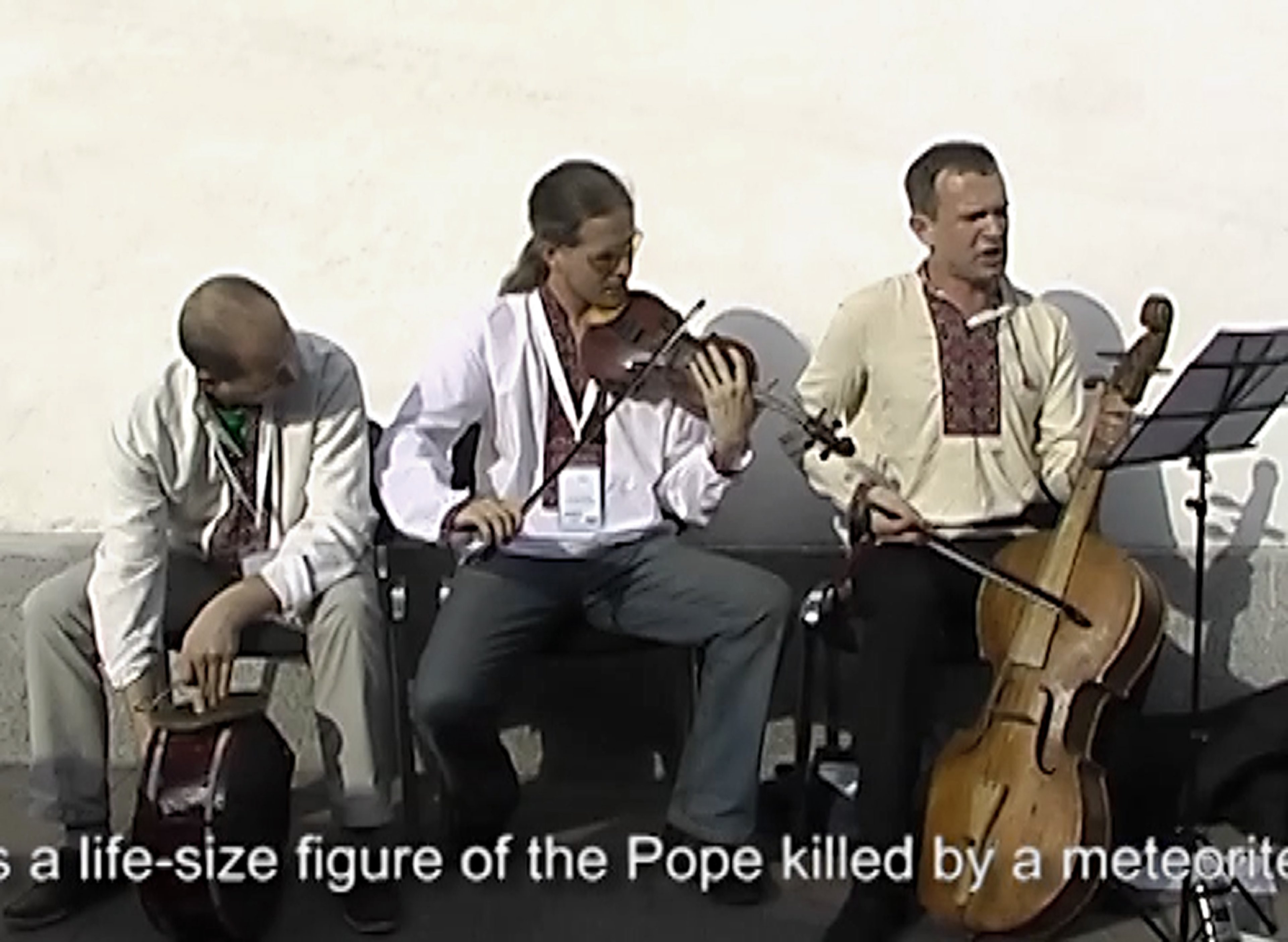 The video installation Mediators includes documentation of six street performances carried out by R.E.P in Kyiv (Ukraine), Gyumri (Armenia), Almaty (Kazakhstan), Plovdiv (Bulgaria), Schwaz (Austria) and Byalystok (Poland).
