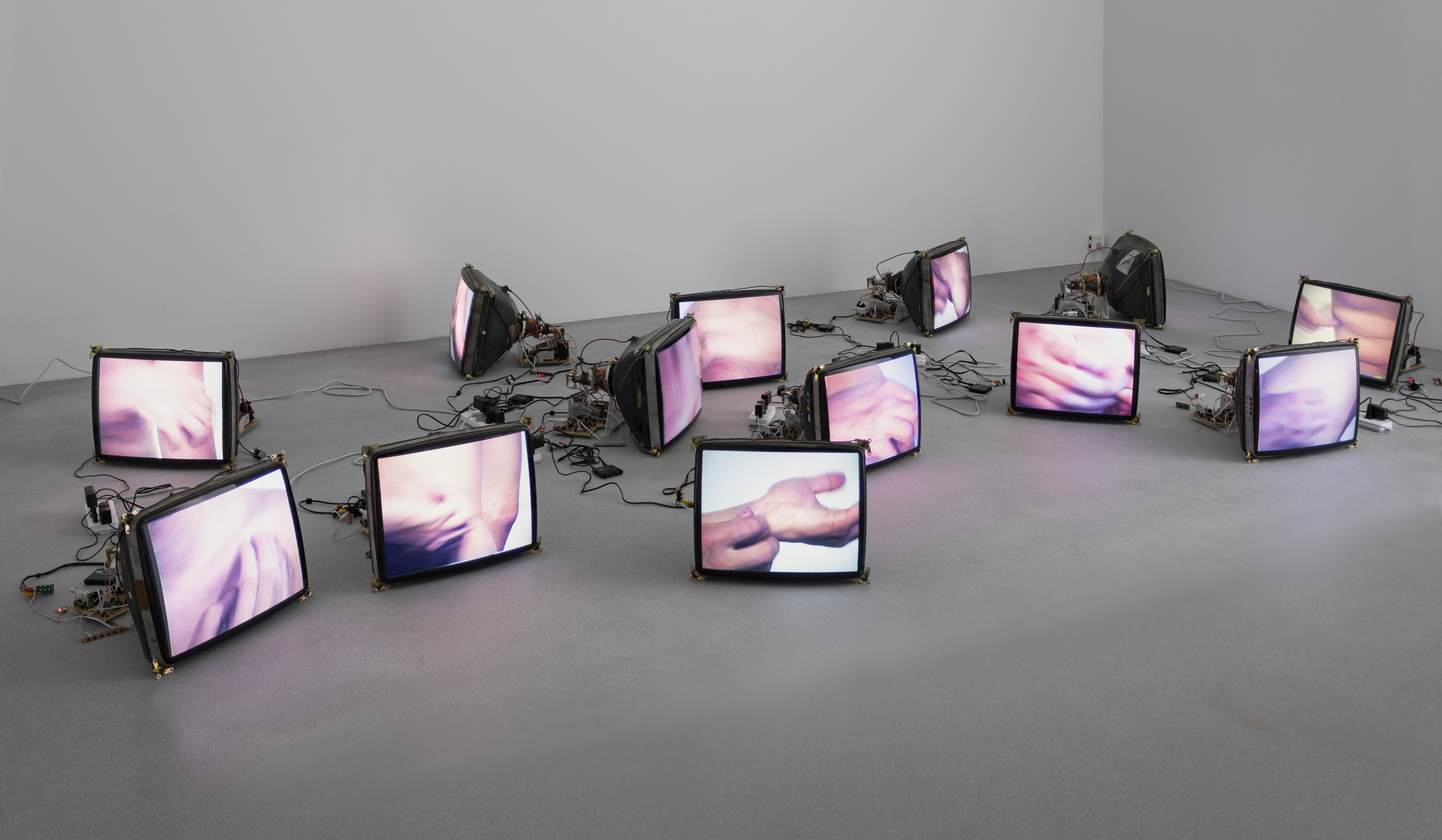 C’est dans ce contexte que Zhang Peili a présenté pour la première fois son installation vidéo Uncertain Pleasure (Les maladies superficielles) (1996), composée de seize canaux vidéo de 30 minutes montrant en gros plan les mains d’une personne grattant différentes parties de son corps. Constituée d’un ensemble de moniteurs disposés au sol, l’installation capture cet acte répétitif et intime sous plusieurs angles, plongeant les spectateurs dans une expérience focalisée. Cette immersion sensorielle suscite une réponse empathique, incitant les spectateurs à ressentir eux-mêmes cette démangeaison. Dans le même temps, elle suscite également un certain malaise. Invoquant les thèmes du voyeurisme et de la surveillance, elle transforme un acte privé en spectacle public.